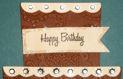 The little scallops cut with the cake. This tiered cake is from the Sweet Treats cartridge, I cut it at 5 1/2" and added the special touch that the two bottom tiers are a pocket to hold the sentiment slip (attached to the top tier). The slip out sentiment piece measure 2 1/4" x 5 1/4".